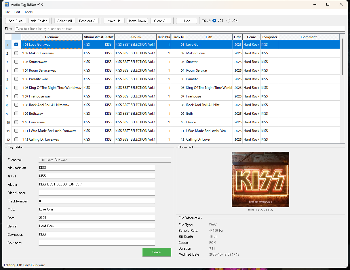 WAV, FLAC, M4A, MP3 ファイルのタグ情報(メタデータ)を編集するツールです。